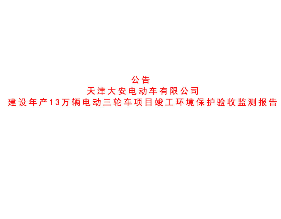 公司動(dòng)態(tài) 天津大安電動(dòng)車(chē)有限公司建設(shè)年產(chǎn)13萬(wàn)輛電動(dòng)三輪車(chē)項(xiàng)目竣工環(huán)境保護(hù)驗(yàn)收監(jiān)測(cè)報(bào)告